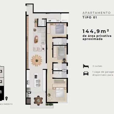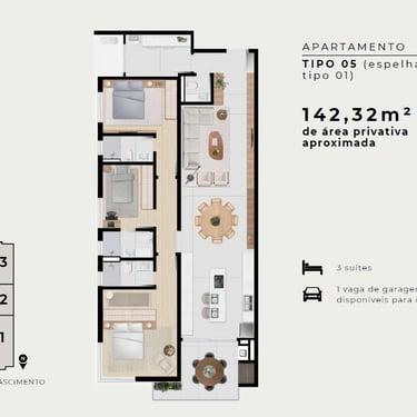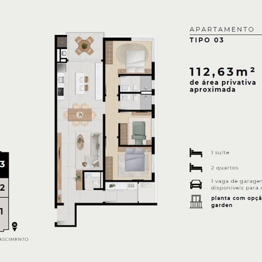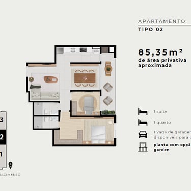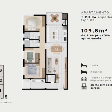 Versatilidade: Opções com Apartamento Garden e infraestrutura pronta (área técnica) para instalação de ar-condicionado.